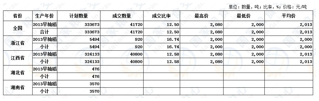 12月1日最低收购价稻谷(2013年)交易结果