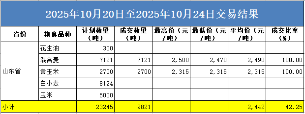 本周山东政策性小麦交易计划数1.52万吨,成交0.71万吨;玉米交易计划数0.77万吨,成交0.27万吨;花生油计划数0.03万吨,未成交。
