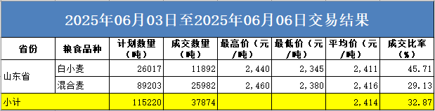 小麦销售计划数4.21万吨,成交1.36万吨,成交率30.49%;采购计划数4.93万吨,成交1.6万吨;购销双向计划数2.38万吨,成交0.82万吨。