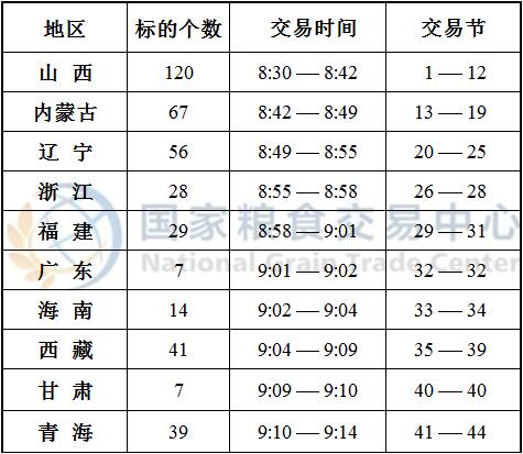 2012年跨省移库最低收购价小麦于8:30开市交易,分地区预估竞价交易时间如下: