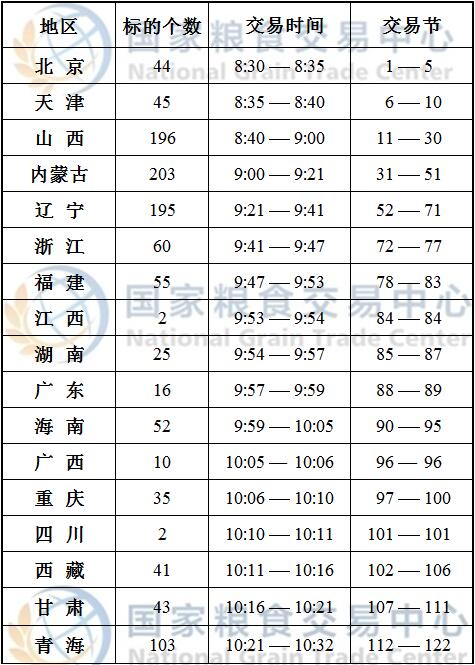 2012年跨省移库最低收购价小麦于8:30开市交易,分地区预估竞价交易时间如下: