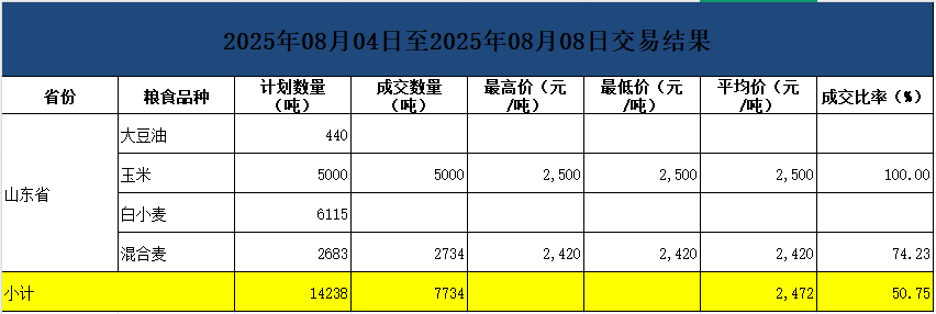 本周山东政策性小麦销售计划数0.37万吨,成交0.27万吨;采购计划数0.51万吨,未成交;玉米销售计划数0.5万吨,全部成交;食用油购销双向计划数0.04万吨,未成交;