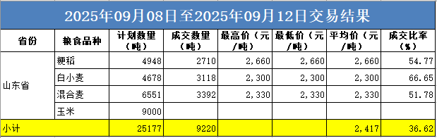 本周山东政策性小麦销售计划数1.12万吨,成交0.65万吨;玉米购销双向计划数0.9万吨,未成交;粳稻计划数0.49万吨,成交0.27万吨。