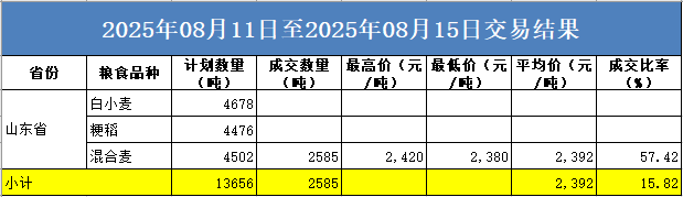 本周山东政策性小麦销售计划数0.92万吨,成交0.26万吨;粳稻购销双向计划数0.45万吨,未成交;