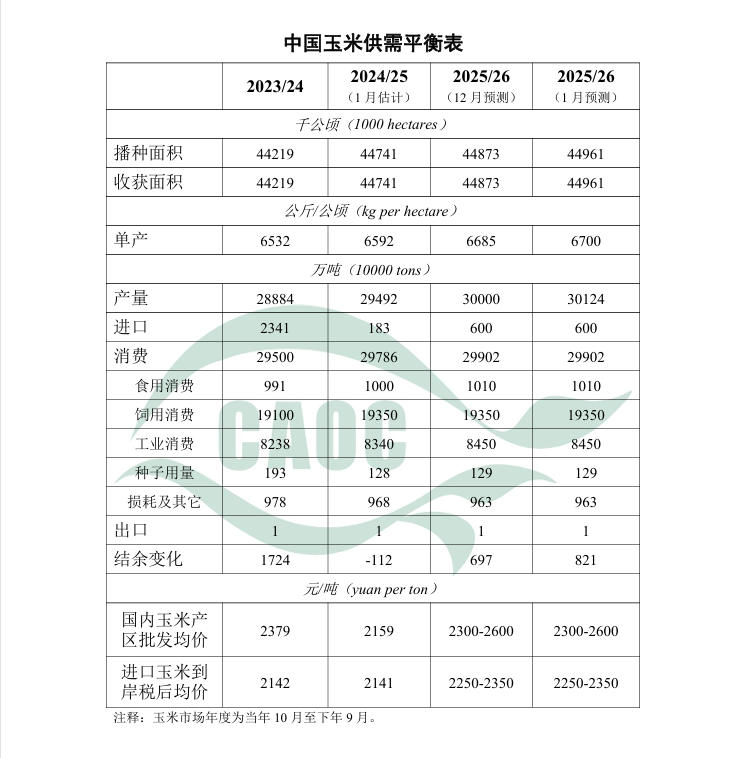 玉米:2025/26年度中国玉米生产数据根据国家统计局公告进行调整,播种面积调整为44961千公顷,比上年增0.5%;单位面积产量调整为每公顷6700公斤,比上年增1.6%;总产量调整为30124万吨,比上年增2.1%,再创历史新高。12月下旬开始,东北产区气温下降,利于玉米脱粒。当前仍处于玉米传统售粮高峰期,市场购销活跃,销售进度同比偏快,深加工企业库存同比偏低,存在补库需求,玉米价格底部支撑较强。