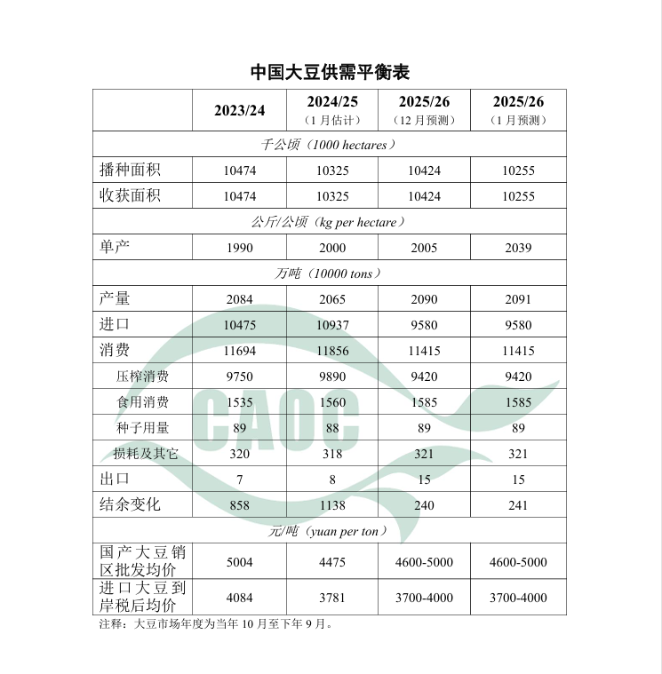 大豆:2025/26年度中国大豆生产预测与国家统计局公布数据基本一致,本月数据根据国家统计局公告进行微调。其中,播种面积调整为10255千公顷,比上年下降0.6%;单位面积产量调整为每公顷2039公斤,比上年增长1.9%;总产量2091万吨,比上年增长1.3%。国内方面,基层余粮持续减少,贸易商惜售情绪较为浓厚,对市场预期形成支撑;高蛋白大豆货源偏紧,加工企业采购积极性较高。国际方面,南美大豆丰产预期较强,产量有望维持高位,全球大豆供应整体保持宽松。