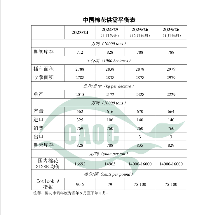 棉花:2025/26年度中国棉花生产预测与国家统计局公布数据基本一致,本月数据根据国家统计局公告进行微调。其中,棉花播种面积调至2979千公顷,较上年增5.0%;单位面积产量调至每公顷2229公斤,较上年增2.6%;总产量调至664万吨,较上年增7.7%。本月进口量和消费量预测数据维持上月不变,期末库存调减至829万吨。受纺织企业春节前补库需求影响,皮棉销售进度明显加快。据中国棉花网数据,截至1月8日,全国棉花加工率94.5%,同比减0.5个百分点;销售率55.6%,同比增24.1个百分点。
