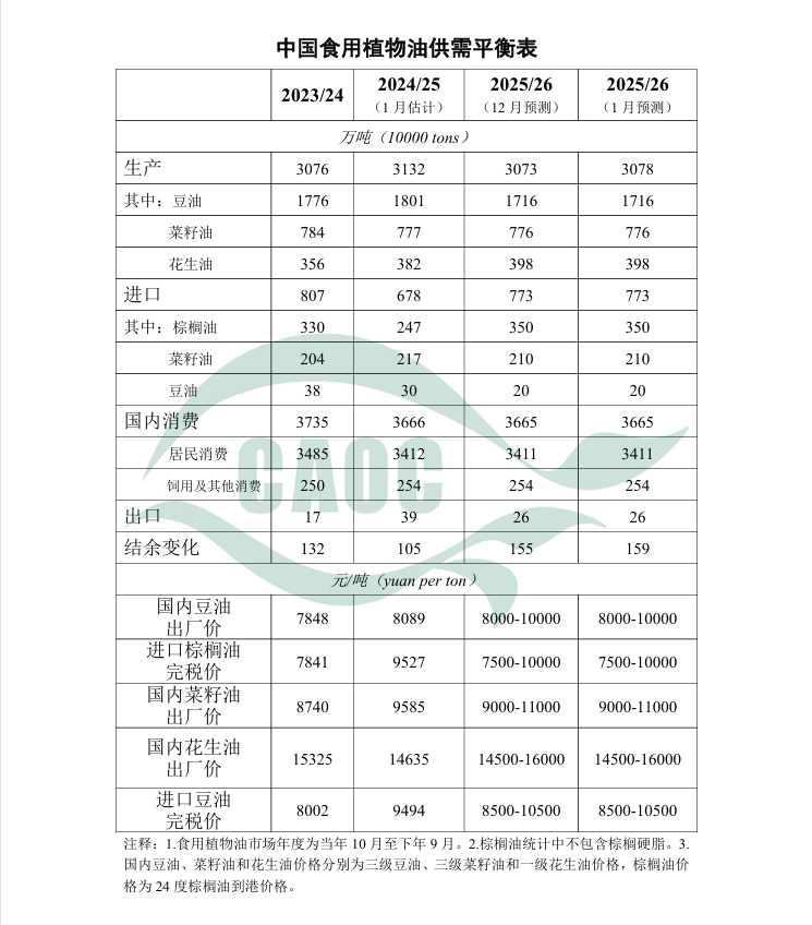 食用植物油:本月将2025/26年度中国食用植物油产量调增5万吨至3078万吨,主要是棉籽油等植物油产量增加。本月暂不对油菜籽及菜籽油产量进行调整。食用植物油进口量、消费量预测与上月保持一致。近期油菜主产区大部平均气温较常年同期偏高,有利于油菜生长和培育壮苗,局部地区需防范阶段性干旱影响油菜移栽成活。