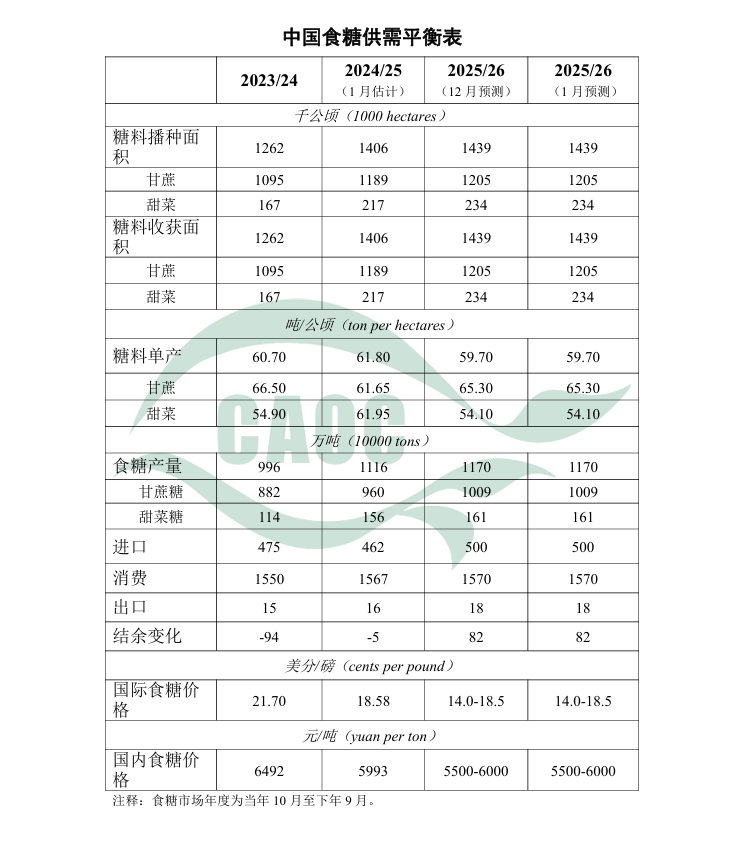 食糖:本月对2025/26年度中国食糖供需形势预测与上月保持一致。目前北方甜菜糖生产进入尾声,南方甘蔗糖生产进入高峰期,国内新糖集中上市,市场供应充足,下游终端商户随用随采。截至12月底,广西累计产糖194万吨,产销率45.56%,同比下降13.76个百分点;云南累计产糖39万吨,产销率71.72%,同比下降9.98个百分点。后期需持续关注天气变化对甘蔗含糖量的影响。国际方面,印度、泰国增产预期较强,巴西产糖维持高位,国际食糖供需宽松。
