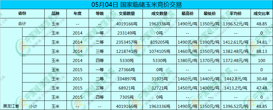 本周临储玉米拍卖投放量由700万吨增至800万吨,其中5月3日投放395万吨,成交率83.77%,溢价20-50元/吨。5月4日投放405万吨玉米,成交率48.85%,溢价在40元/吨以下(如下图所示)。临储拍卖不断加量冲击市场,玉米价格负重前行,陷入“跌跌不休”的境地。中国粮油信息网分析师周喆认为随着临储拍卖持续加量,短期内玉米价格行情还将承压下行,具体原因如下。