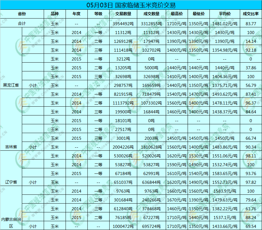 据本网统计,经过4周的拍卖后国家库存还有1.6亿吨以上的临储玉米,国家坚定的执行陈粮去库存计划。据国家粮食交易中心交易公告显示,从5月起玉米周度投放总量已增加至800万吨,此量之多将会影响后期玉米拍卖的溢价幅度,低溢价或底价成交将成为大概率事件,直接拖累玉米现货行情继续走低,这样一来无疑是给玉米市场雪上加霜。